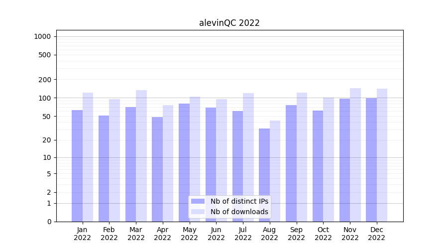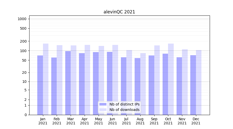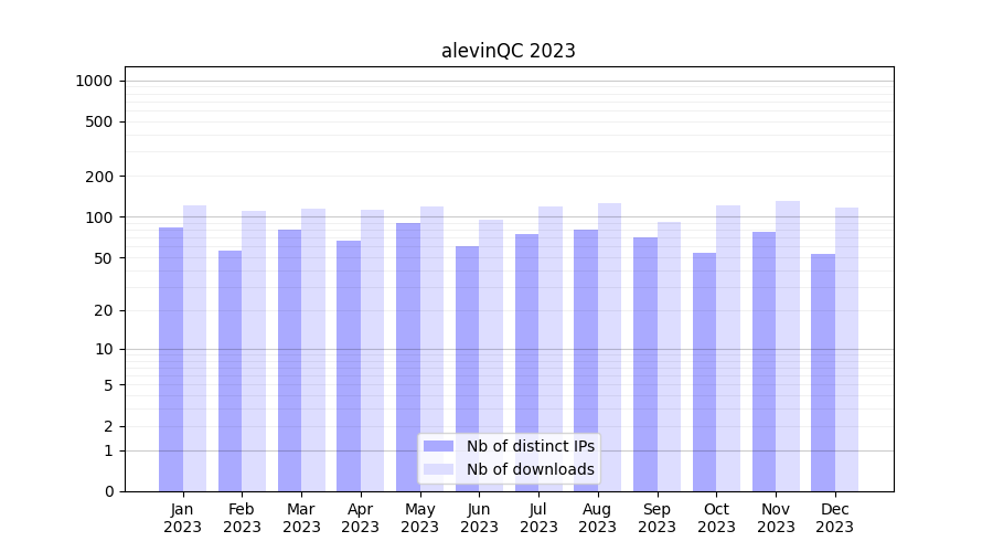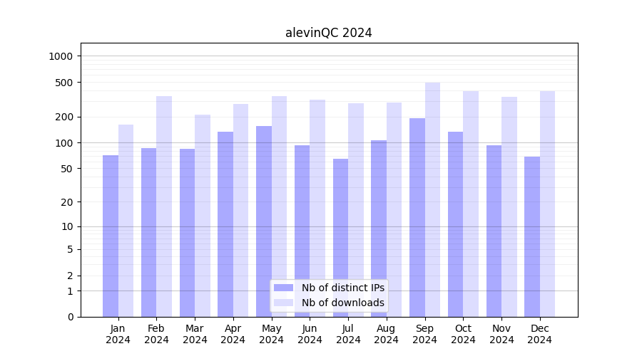 Number of downloads for software package alevinQC, year by year, from 2025 back to 2014 (years with no downloads are omitted):