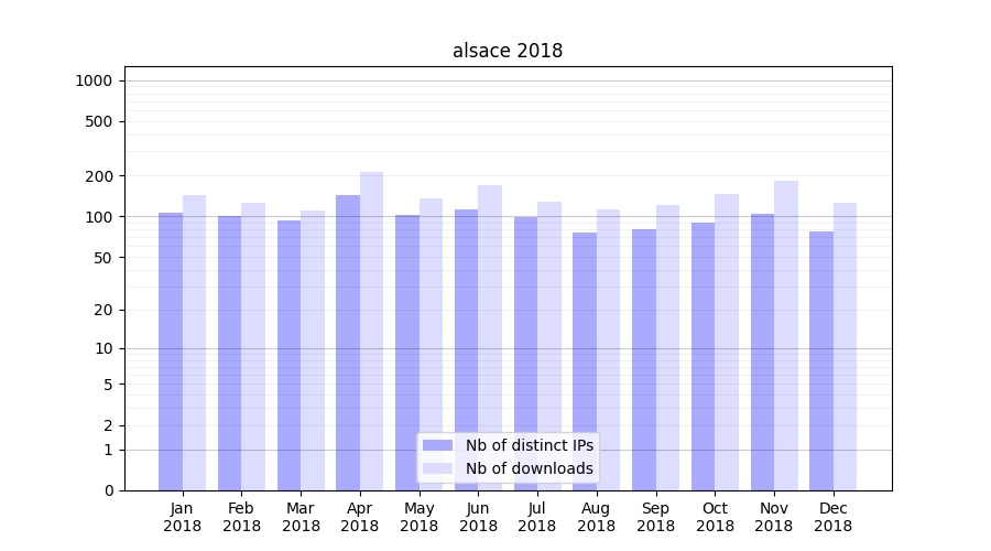 Number of downloads for software package alsace, year by year, from 2025 back to 2014 (years with no downloads are omitted):