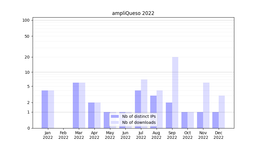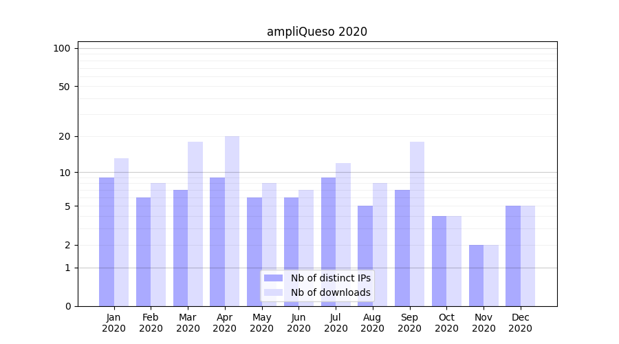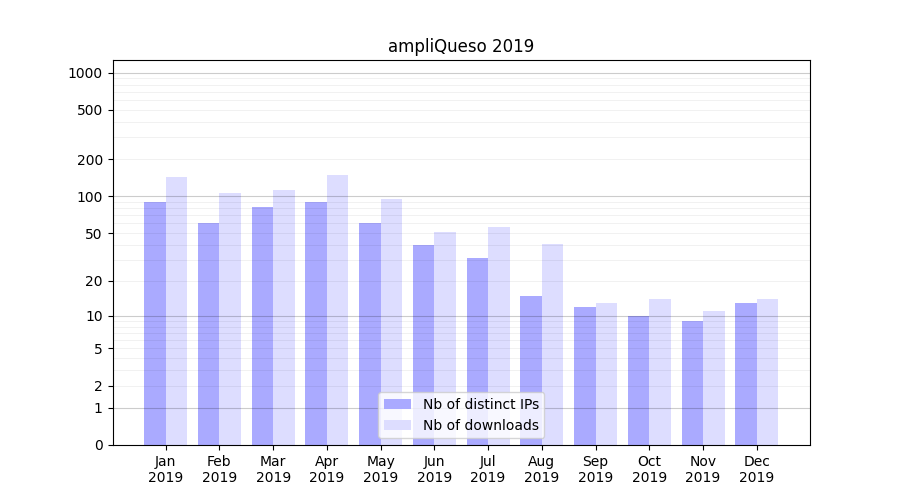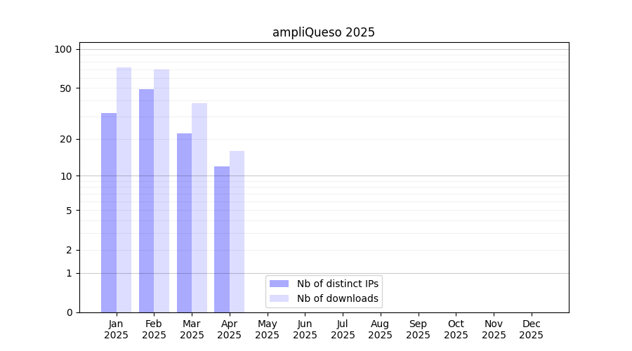 Number of downloads for software package ampliQueso, year by year, from 2025 back to 2014 (years with no downloads are omitted):