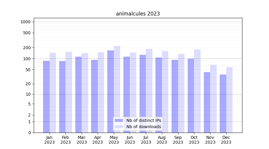 Number of downloads for software package animalcules, year by year, from 2025 back to 2014 (years with no downloads are omitted):