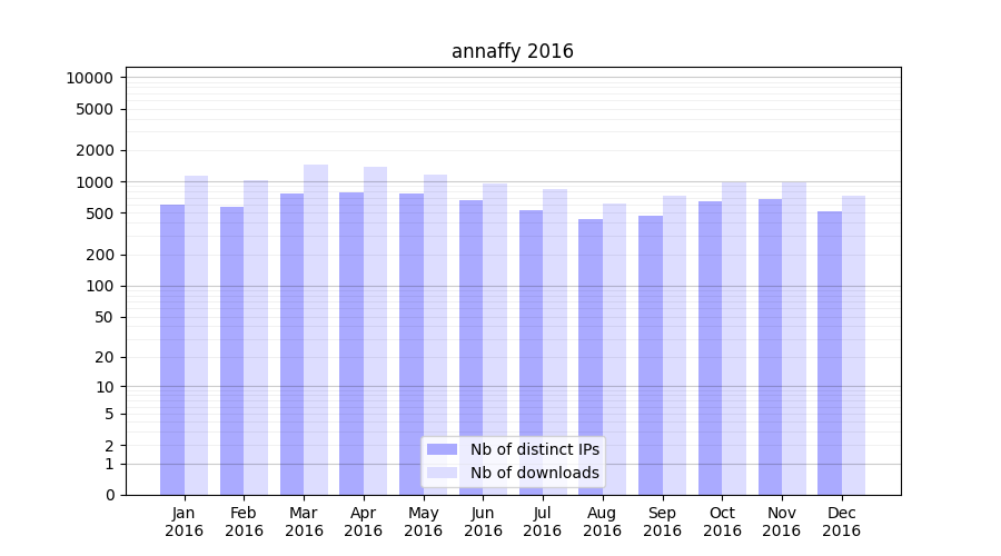 Number of downloads for software package annaffy, year by year, from 2025 back to 2014 (years with no downloads are omitted):