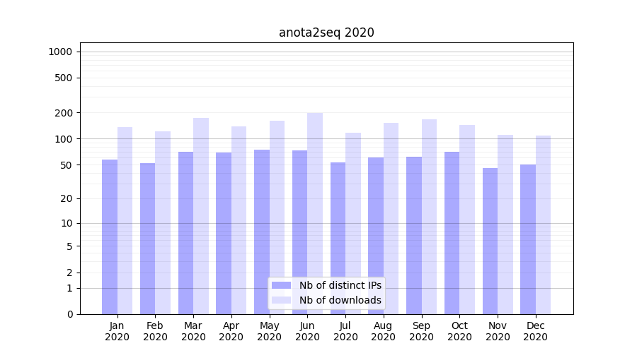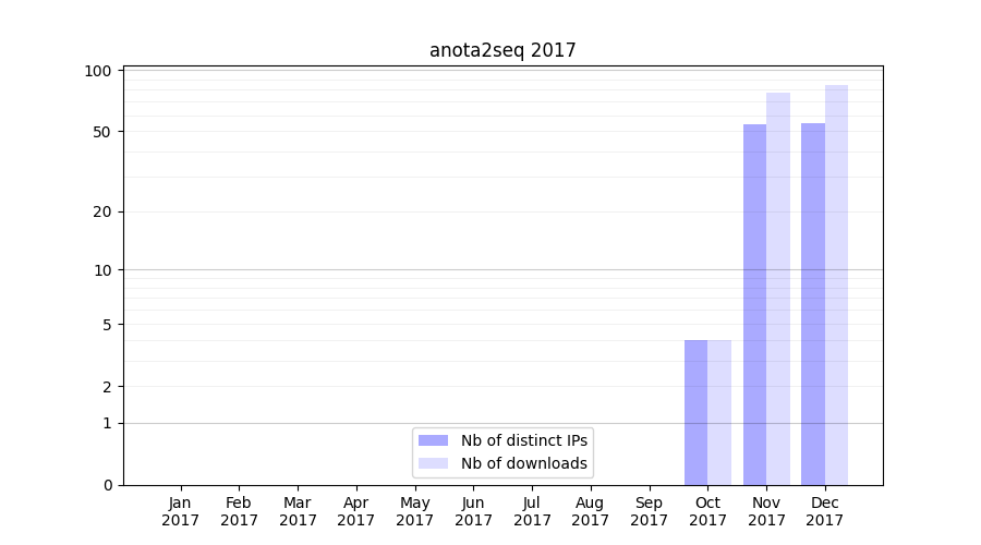 Number of downloads for software package anota2seq, year by year, from 2025 back to 2014 (years with no downloads are omitted):