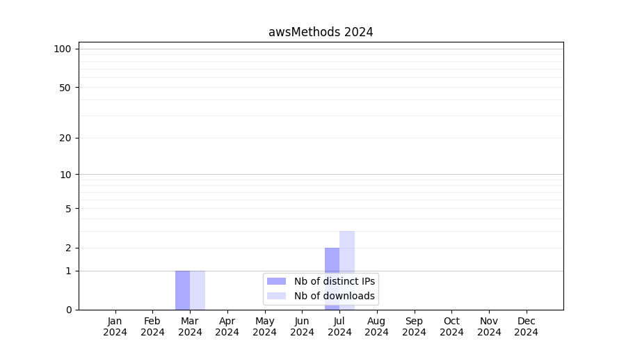 Number of downloads for software package awsMethods, year by year, from 2025 back to 2014 (years with no downloads are omitted):