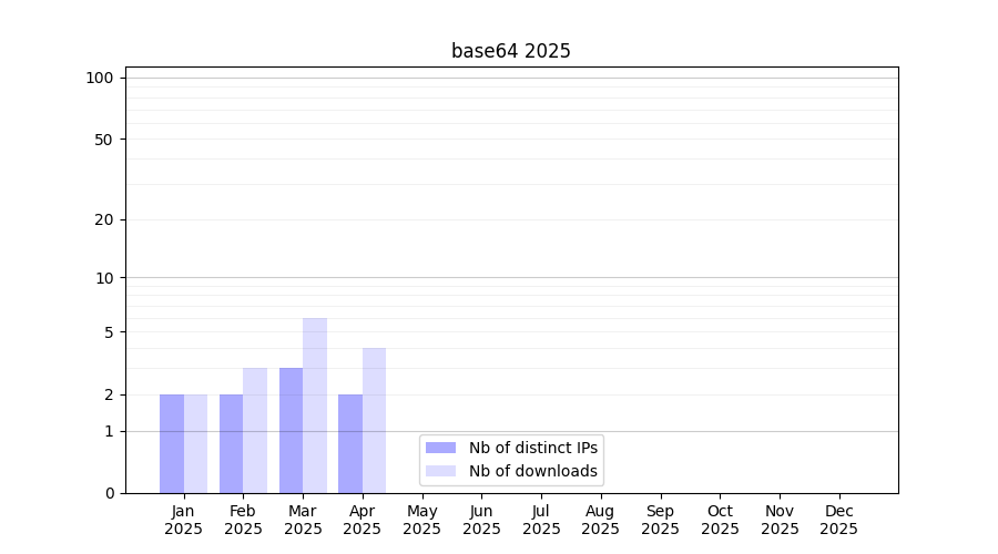 Number of downloads for software package base64, year by year, from 2025 back to 2014 (years with no downloads are omitted):