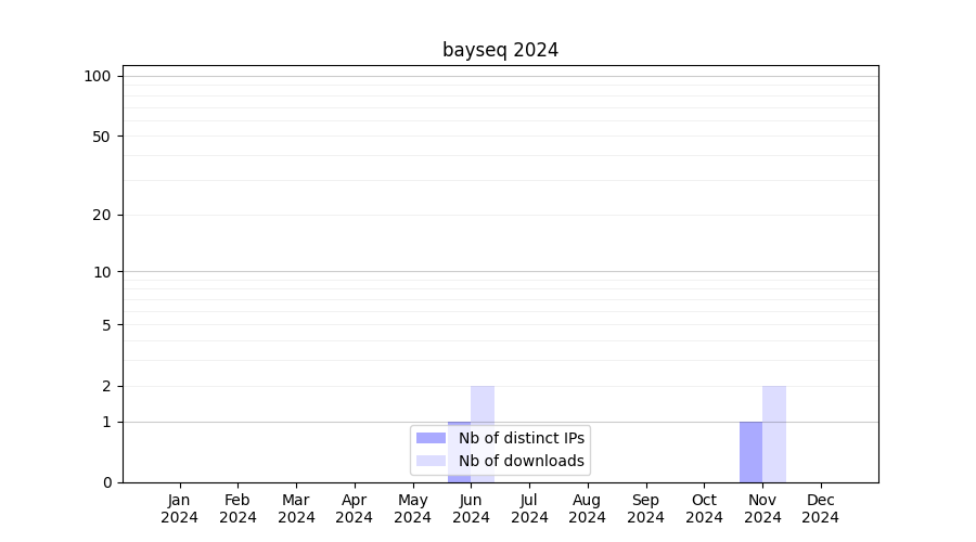 Number of downloads for software package bayseq, year by year, from 2025 back to 2014 (years with no downloads are omitted):