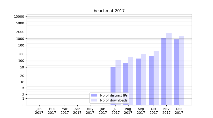 Number of downloads for software package beachmat, year by year, from 2025 back to 2014 (years with no downloads are omitted):