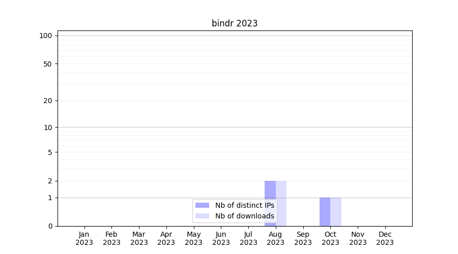 Number of downloads for software package bindr, year by year, from 2025 back to 2014 (years with no downloads are omitted):