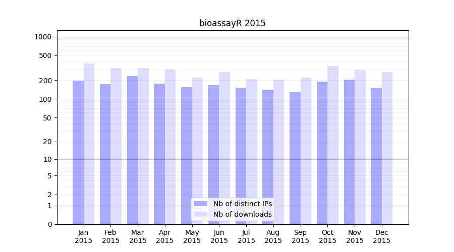 Number of downloads for software package bioassayR, year by year, from 2025 back to 2014 (years with no downloads are omitted):