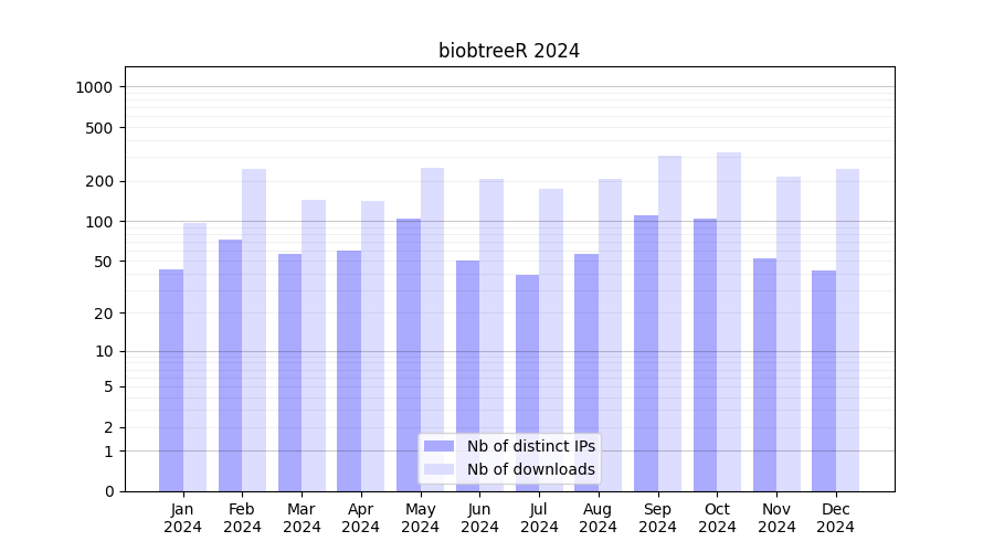 Number of downloads for software package biobtreeR, year by year, from 2025 back to 2014 (years with no downloads are omitted):
