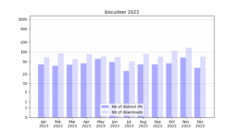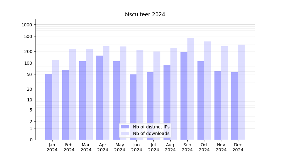 Number of downloads for software package biscuiteer, year by year, from 2025 back to 2014 (years with no downloads are omitted):