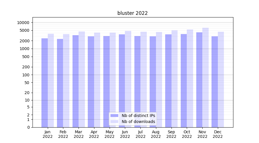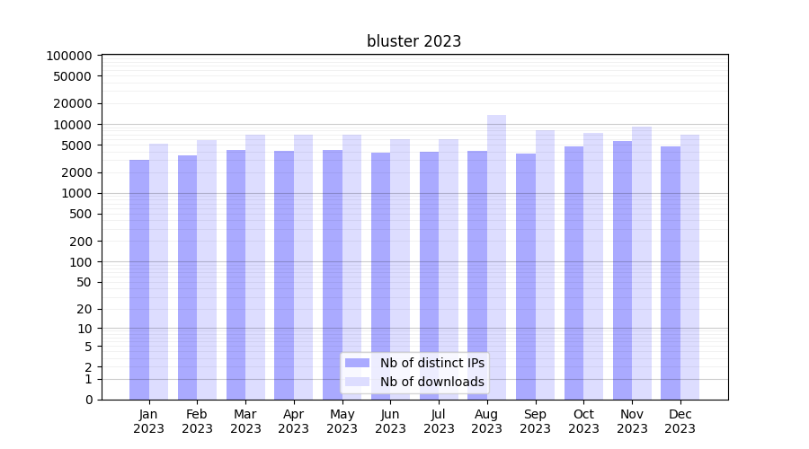 Number of downloads for software package bluster, year by year, from 2025 back to 2014 (years with no downloads are omitted):