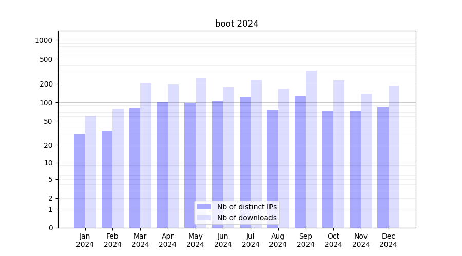 Number of downloads for software package boot, year by year, from 2025 back to 2014 (years with no downloads are omitted):