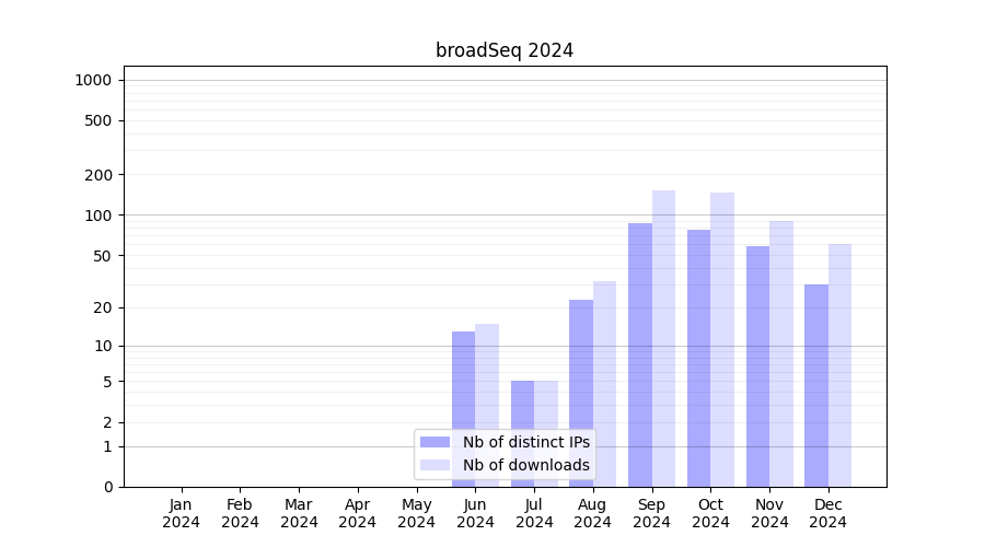 Number of downloads for software package broadSeq, year by year, from 2025 back to 2014 (years with no downloads are omitted):