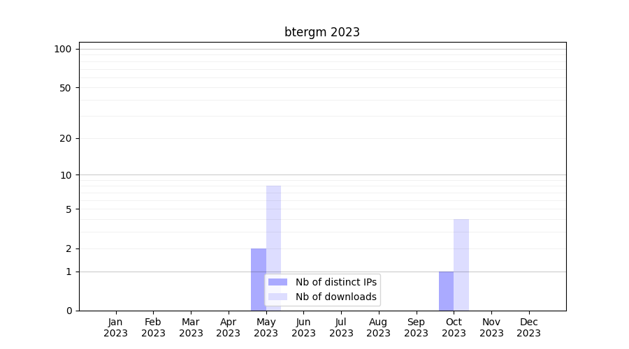 Number of downloads for software package btergm, year by year, from 2025 back to 2014 (years with no downloads are omitted):