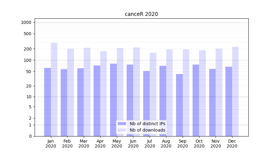 Number of downloads for software package canceR, year by year, from 2025 back to 2014 (years with no downloads are omitted):