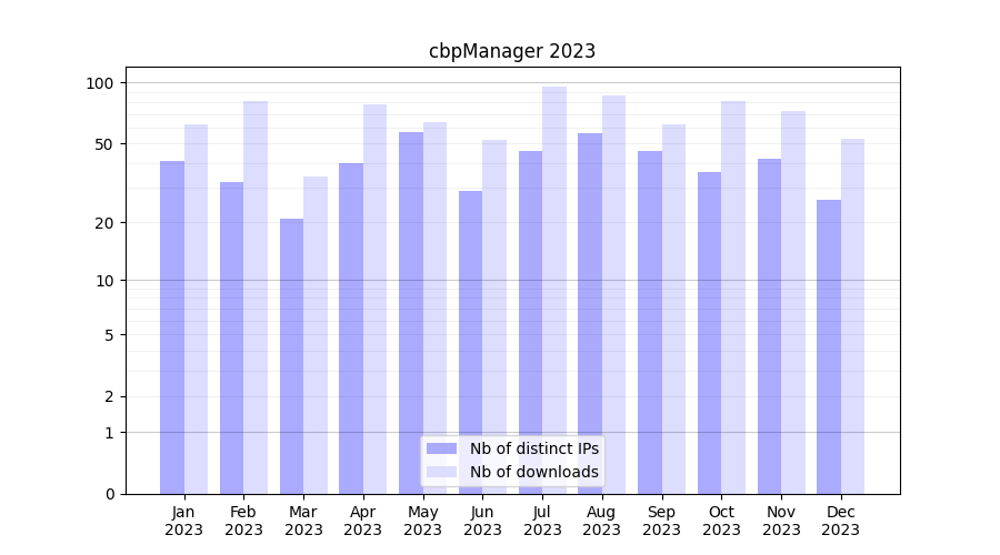 Number of downloads for software package cbpManager, year by year, from 2025 back to 2014 (years with no downloads are omitted):
