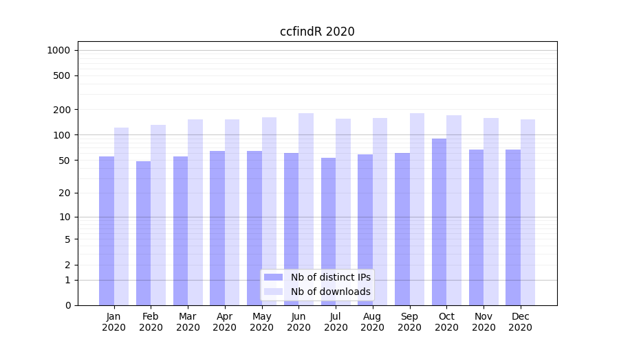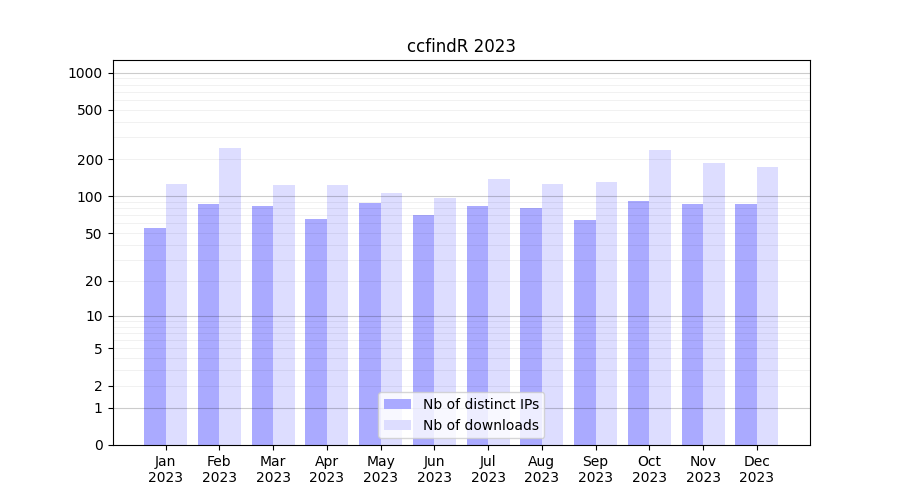 Number of downloads for software package ccfindR, year by year, from 2025 back to 2014 (years with no downloads are omitted):