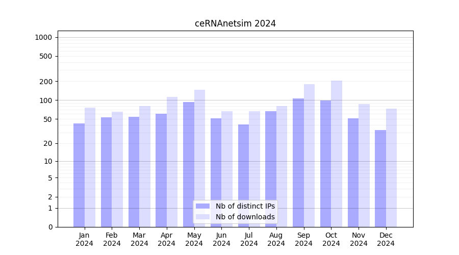 Number of downloads for software package ceRNAnetsim, year by year, from 2025 back to 2014 (years with no downloads are omitted):