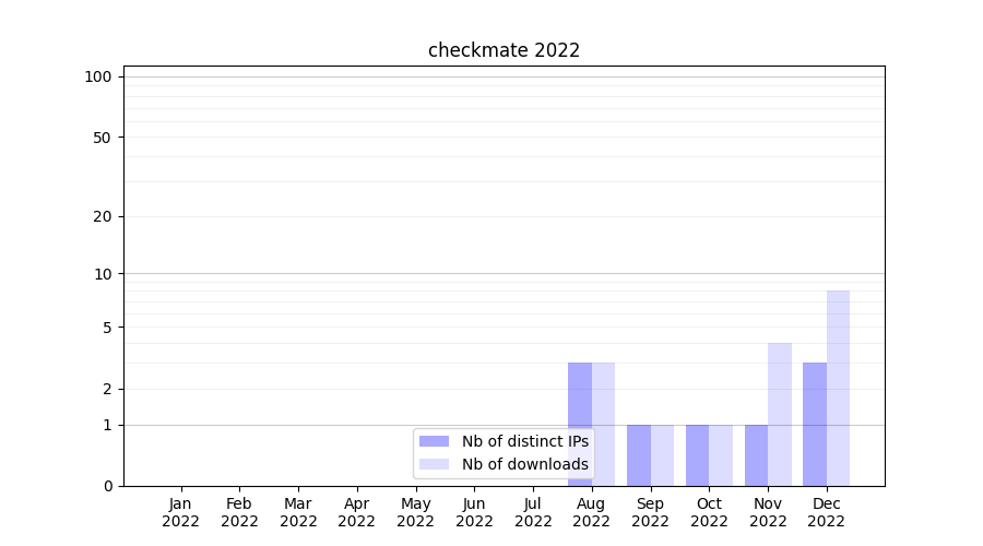 Number of downloads for software package checkmate, year by year, from 2025 back to 2014 (years with no downloads are omitted):