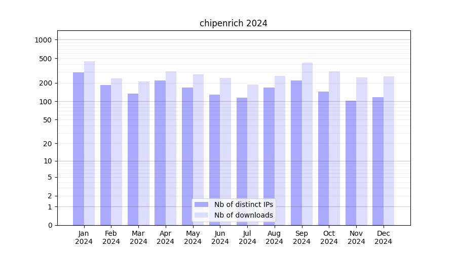 Number of downloads for software package chipenrich, year by year, from 2025 back to 2014 (years with no downloads are omitted):