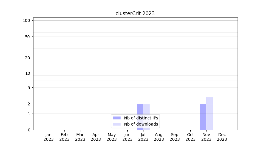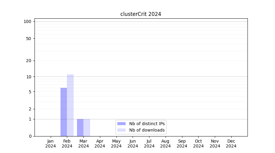 Number of downloads for software package clusterCrit, year by year, from 2025 back to 2014 (years with no downloads are omitted):