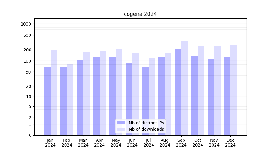 Number of downloads for software package cogena, year by year, from 2025 back to 2014 (years with no downloads are omitted):