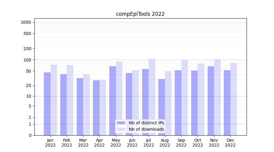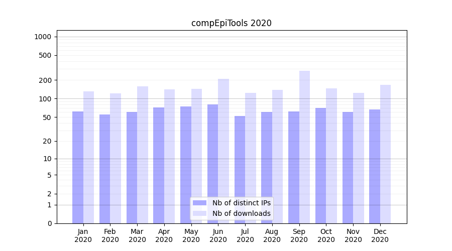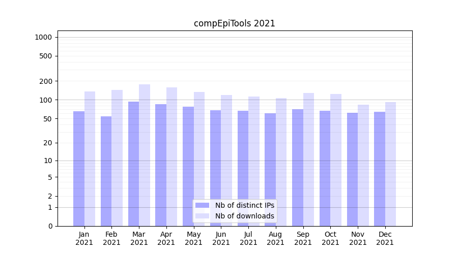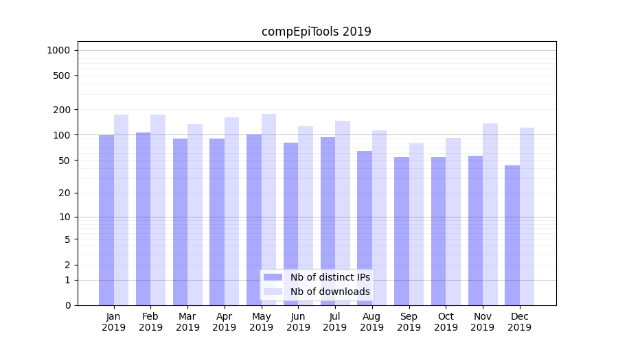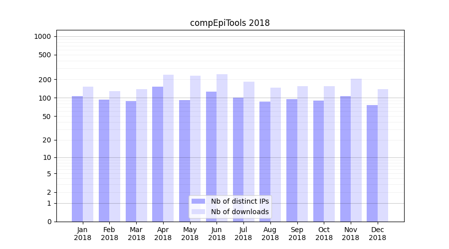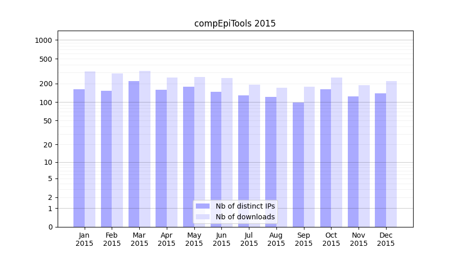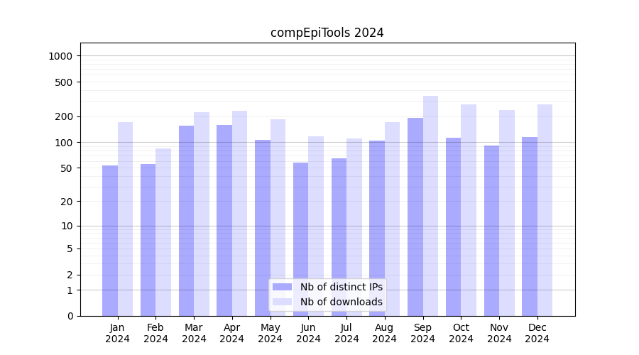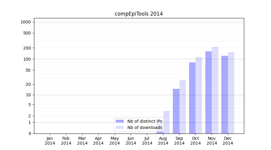 Number of downloads for software package compEpiTools, year by year, from 2025 back to 2014 (years with no downloads are omitted):