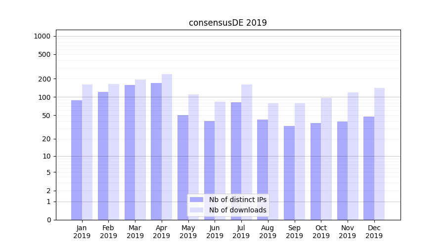 Number of downloads for software package consensusDE, year by year, from 2025 back to 2014 (years with no downloads are omitted):
