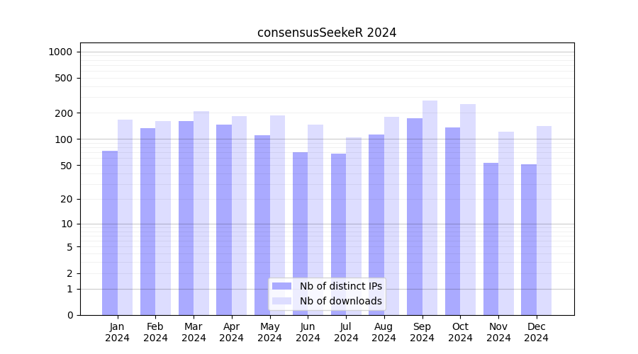 Number of downloads for software package consensusSeekeR, year by year, from 2025 back to 2014 (years with no downloads are omitted):