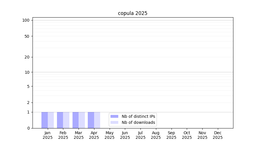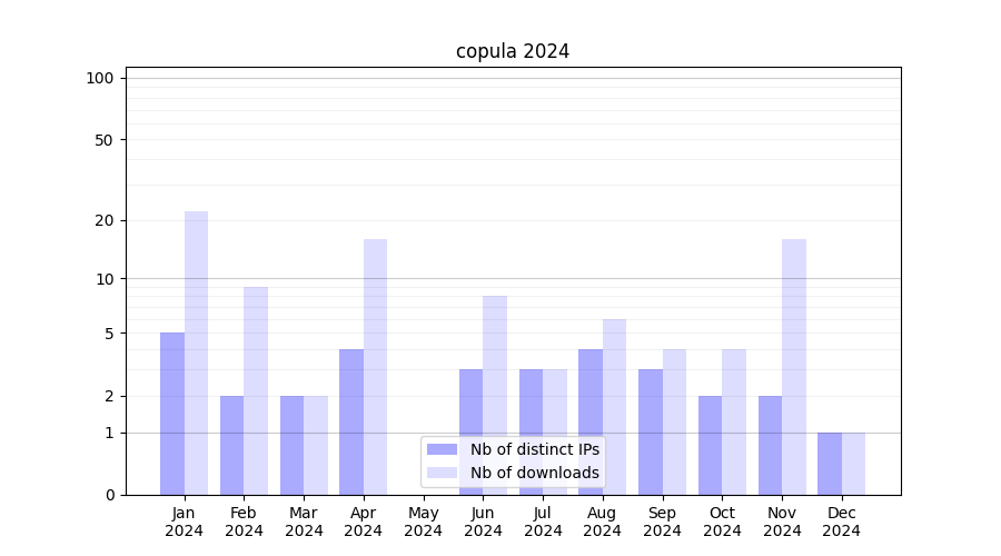 Number of downloads for software package copula, year by year, from 2025 back to 2014 (years with no downloads are omitted):