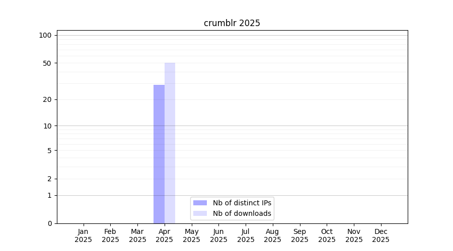 Number of downloads for software package crumblr, year by year, from 2025 back to 2014 (years with no downloads are omitted):