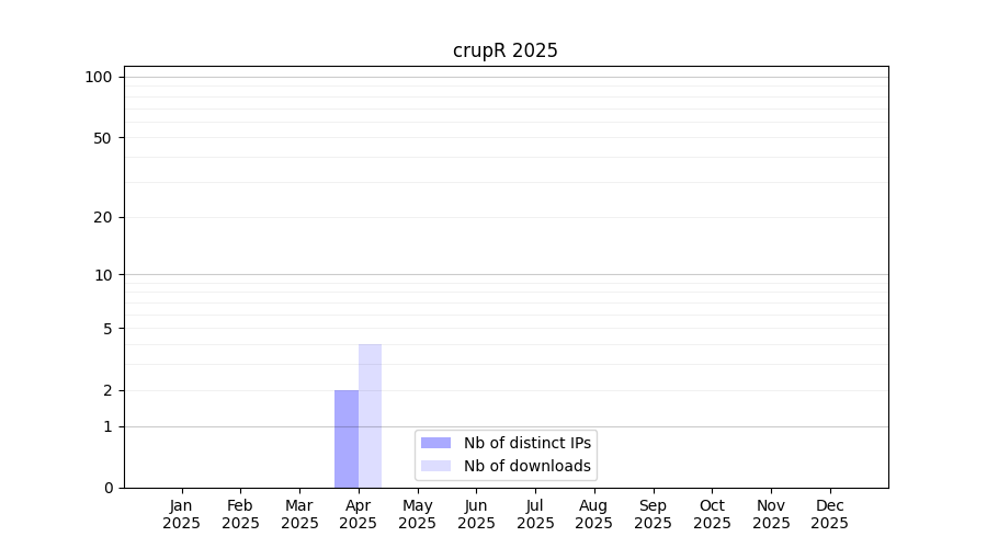 Number of downloads for software package crupR, year by year, from 2025 back to 2014 (years with no downloads are omitted):