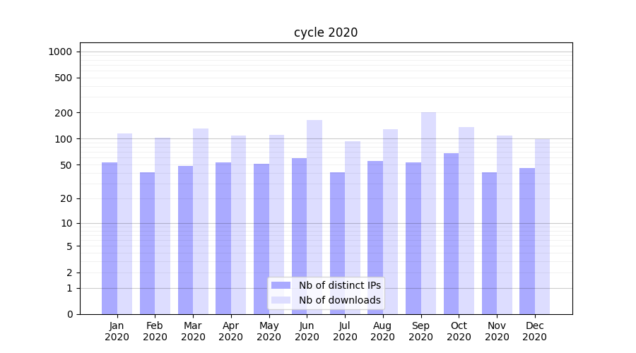 Number of downloads for software package cycle, year by year, from 2025 back to 2014 (years with no downloads are omitted):