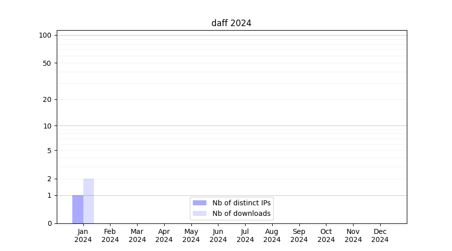 Number of downloads for software package daff, year by year, from 2025 back to 2014 (years with no downloads are omitted):