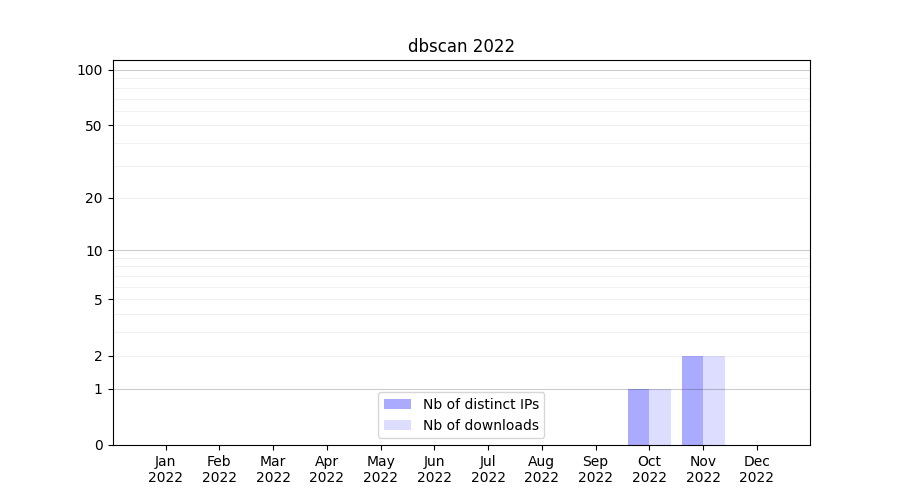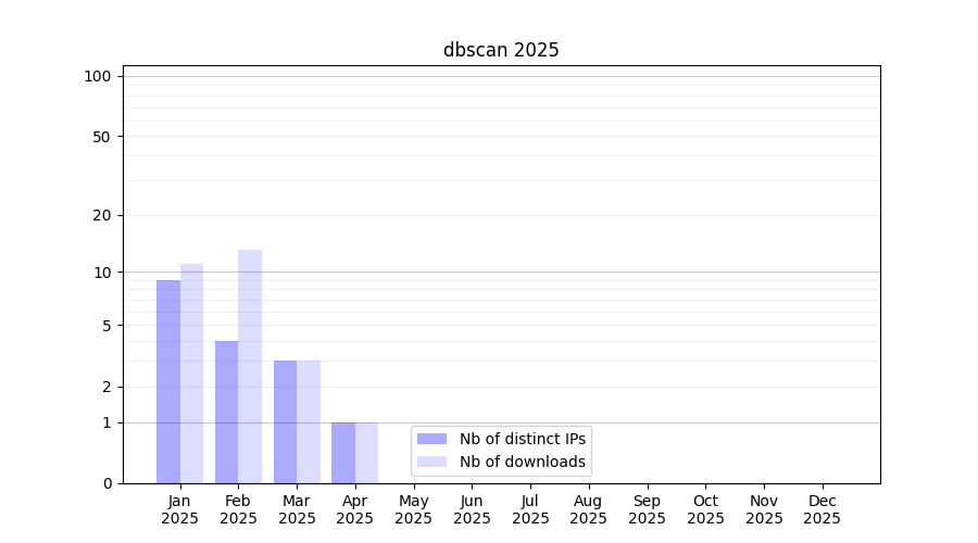 Number of downloads for software package dbscan, year by year, from 2025 back to 2014 (years with no downloads are omitted):