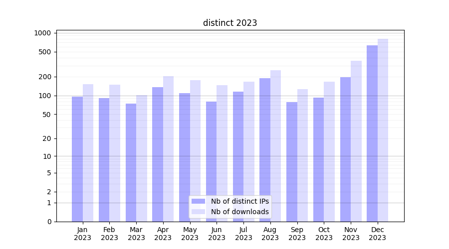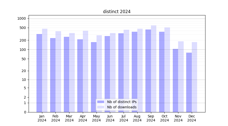Number of downloads for software package distinct, year by year, from 2025 back to 2014 (years with no downloads are omitted):