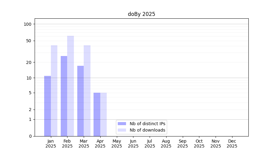 Number of downloads for software package doBy, year by year, from 2025 back to 2014 (years with no downloads are omitted):