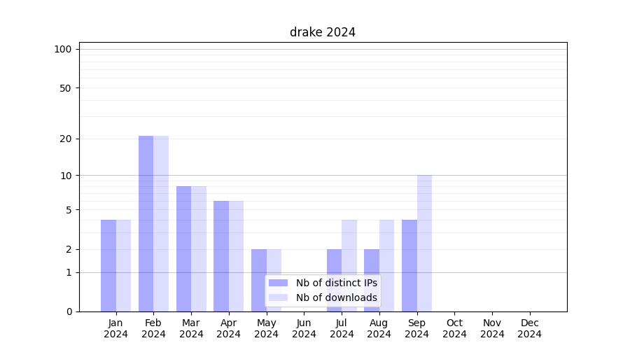 Number of downloads for software package drake, year by year, from 2025 back to 2014 (years with no downloads are omitted):