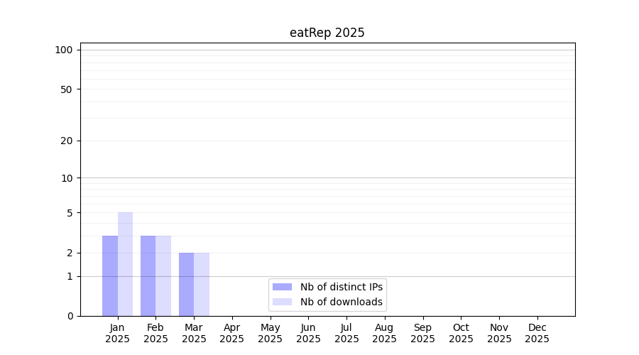 Number of downloads for software package eatRep, year by year, from 2025 back to 2014 (years with no downloads are omitted):