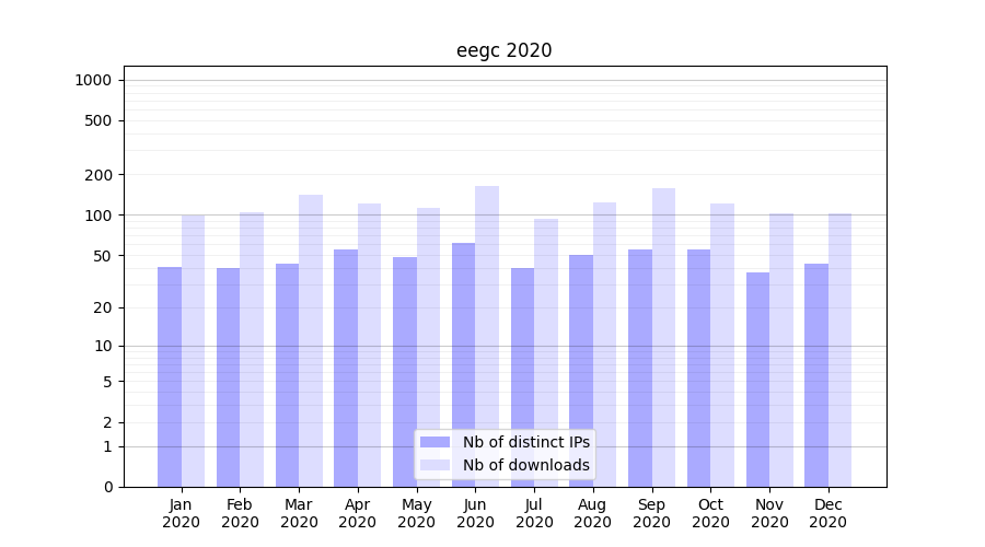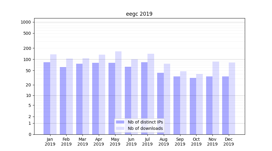 Number of downloads for software package eegc, year by year, from 2025 back to 2014 (years with no downloads are omitted):