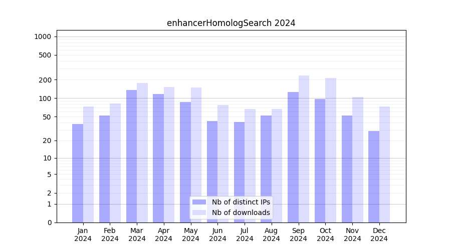 Number of downloads for software package enhancerHomologSearch, year by year, from 2025 back to 2014 (years with no downloads are omitted):