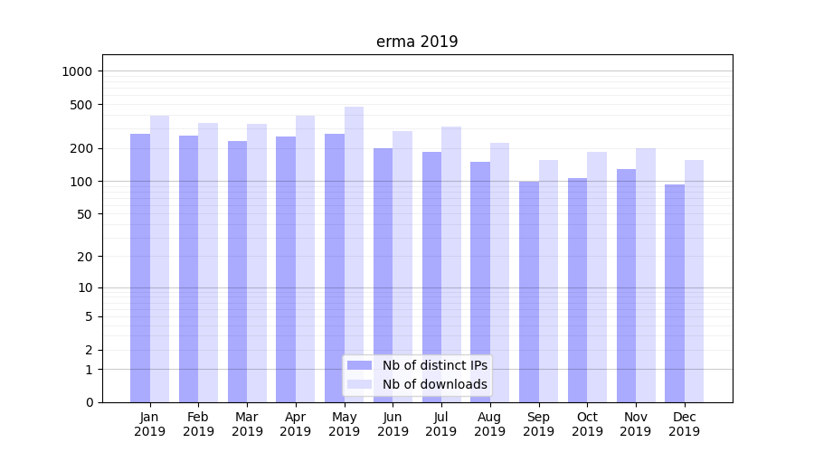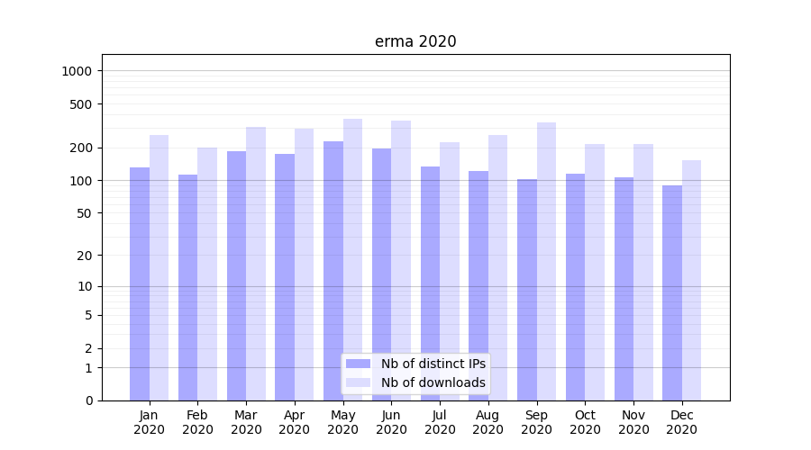 Number of downloads for software package erma, year by year, from 2025 back to 2014 (years with no downloads are omitted):
