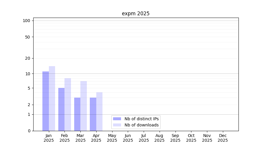 Number of downloads for software package expm, year by year, from 2025 back to 2014 (years with no downloads are omitted):