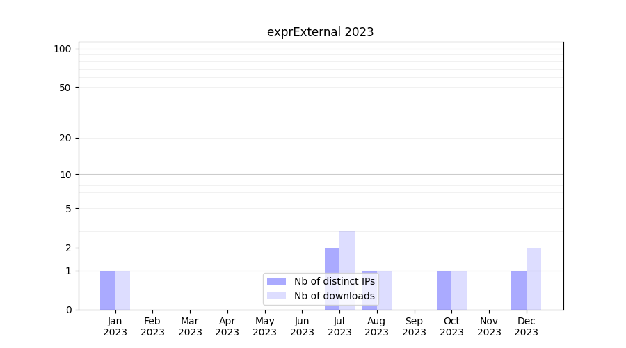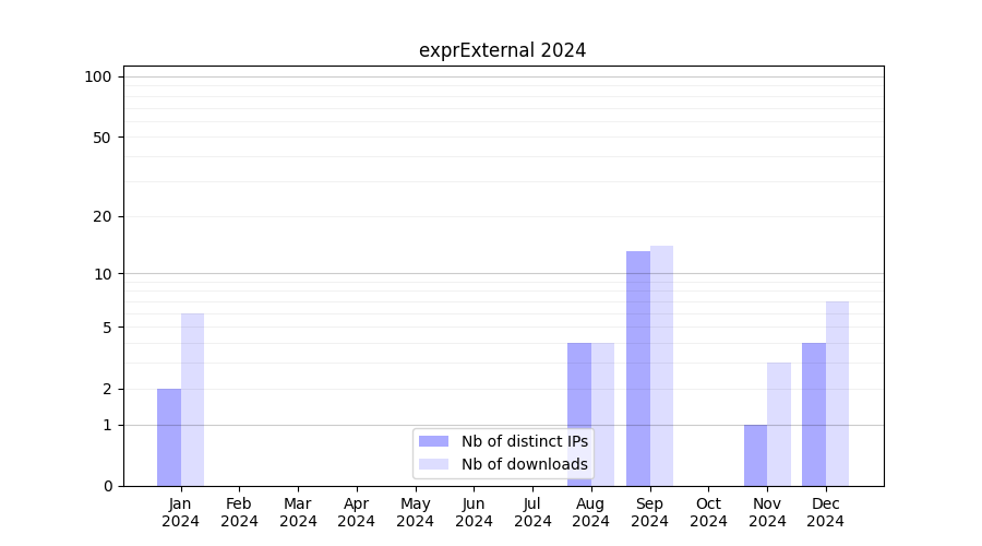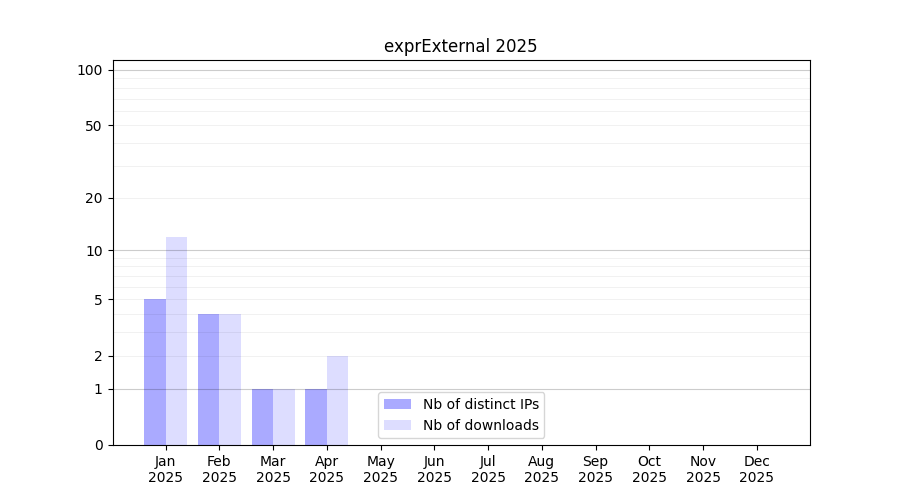 Number of downloads for software package exprExternal, year by year, from 2025 back to 2014 (years with no downloads are omitted):