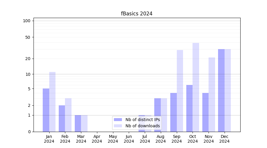 Number of downloads for software package fBasics, year by year, from 2025 back to 2014 (years with no downloads are omitted):