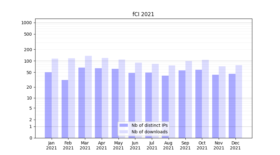 Number of downloads for software package fCI, year by year, from 2025 back to 2014 (years with no downloads are omitted):