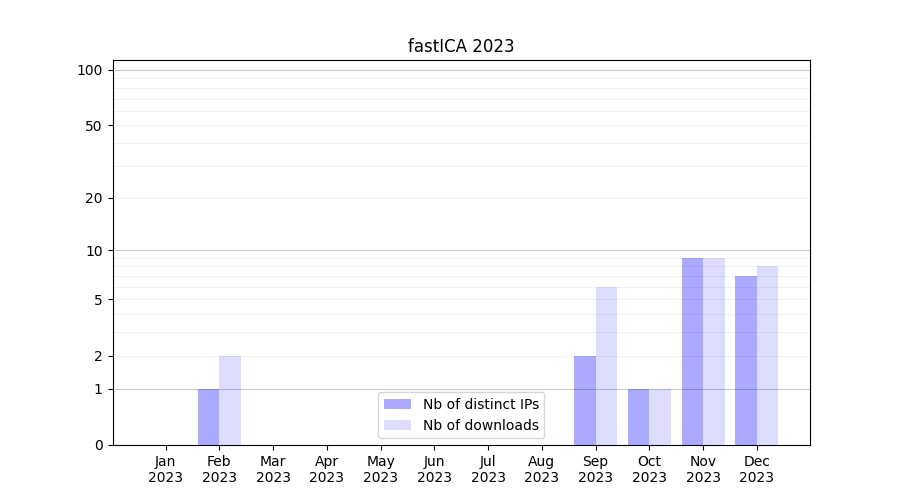Number of downloads for software package fastICA, year by year, from 2025 back to 2014 (years with no downloads are omitted):