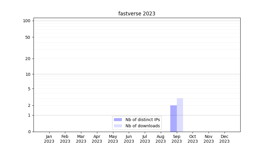 Number of downloads for software package fastverse, year by year, from 2025 back to 2014 (years with no downloads are omitted):