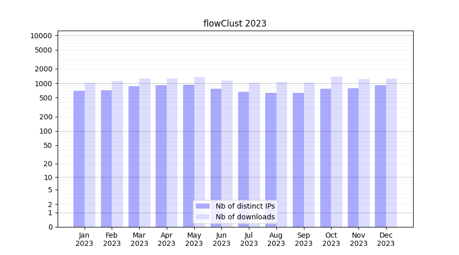 Number of downloads for software package flowClust, year by year, from 2025 back to 2014 (years with no downloads are omitted):