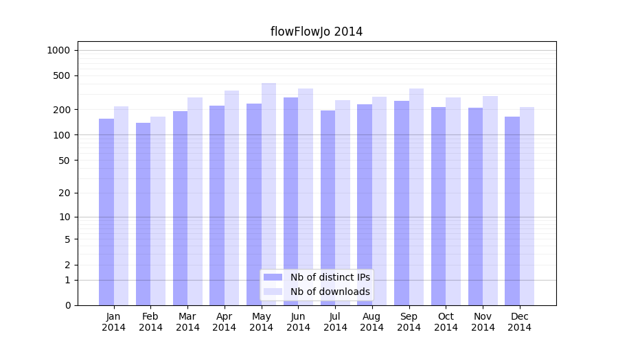 Number of downloads for software package flowFlowJo, year by year, from 2025 back to 2014 (years with no downloads are omitted):
